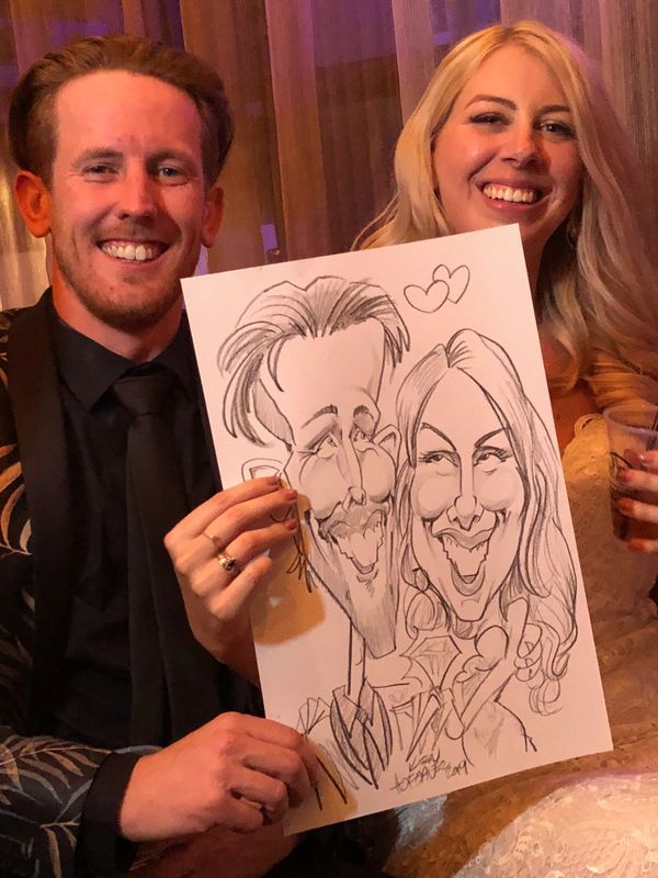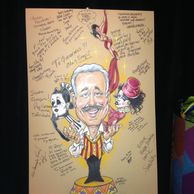 Caricatures drawn on a large poster sized matt boards welcome the guests and allow them to sign and write a personalized note on the artwork.